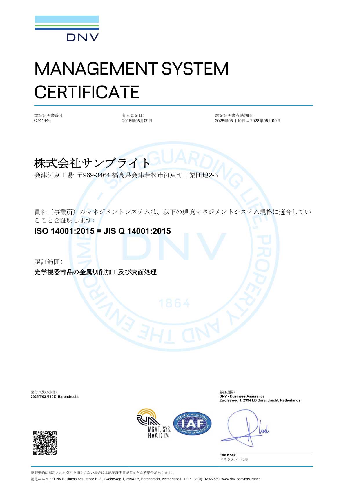 当社では、高品質な製品の提供を目指して「ISO9001」を取得、また、生産活動と環境への貢献の両立を目指して「ISO14001」を取得しました。